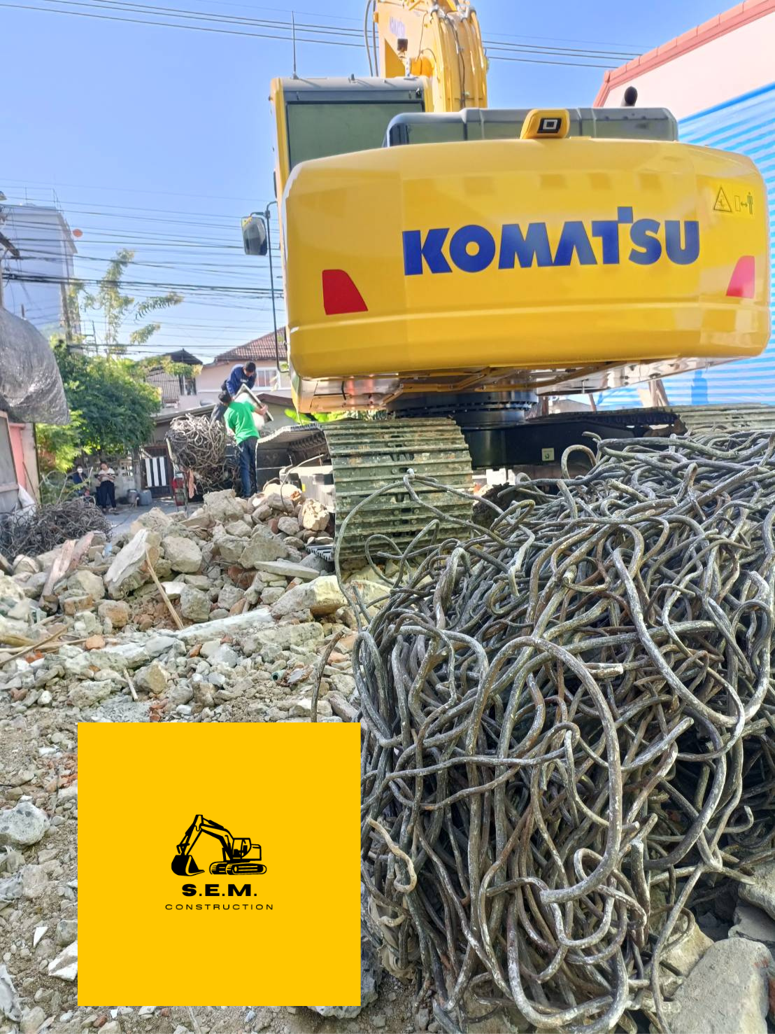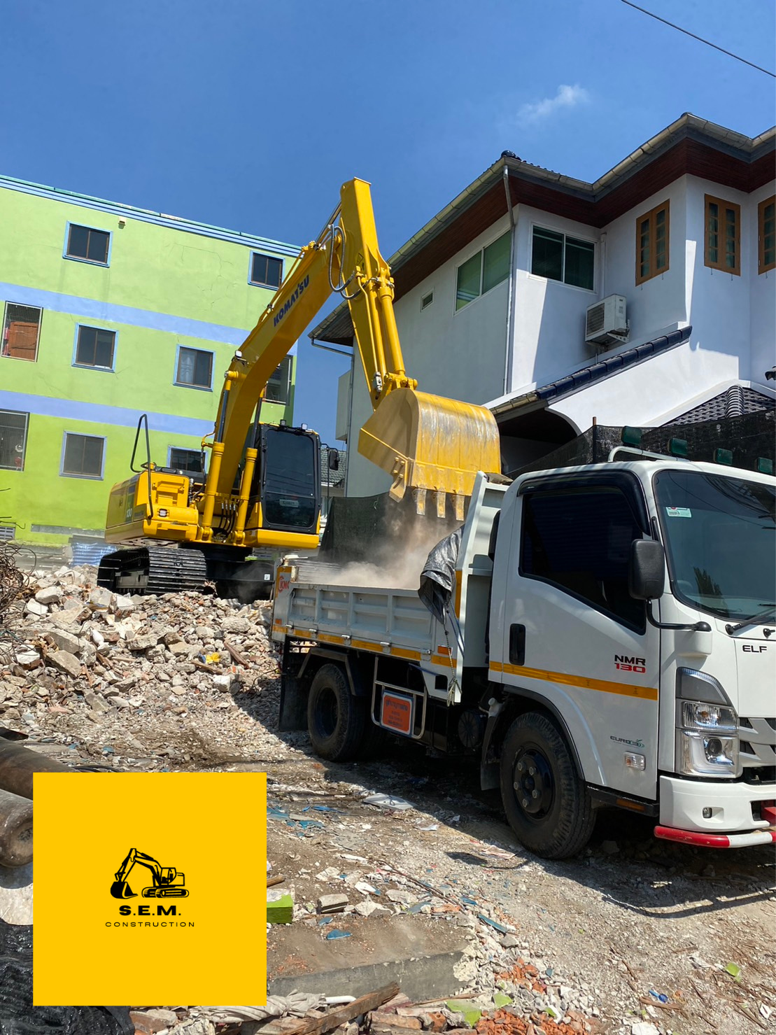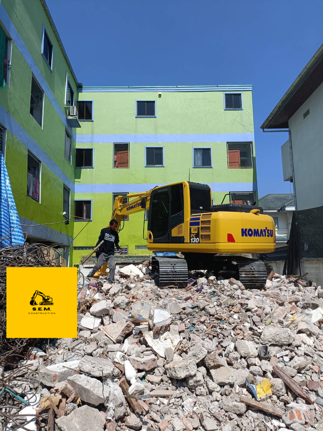 เคลียร์พื้นที่ด้วยรถแบคโฮ Komatsu PC130-10M0 แยกเหล็กออกจากเศษปูน เอาเศษปูนไปทิ้งและใช้หัวกระแทกเคลียร์โครงสร้างบริเวณภาคพื้นดิน ใช้เวลาทั้งสิ้น 3 วัน